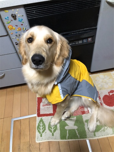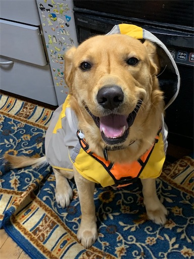 2023-12-22 マックスのカッパ 雨の日の散歩にはアトムは行きません家の中でオシッコもウンチもするので無理して行く必要もないのです。だからカッパを着ることもありませんが、試しに着せてみました。 満面の笑みで喜んでいます。 マックスに初めてカッパを着せた時はやや不機嫌でした。